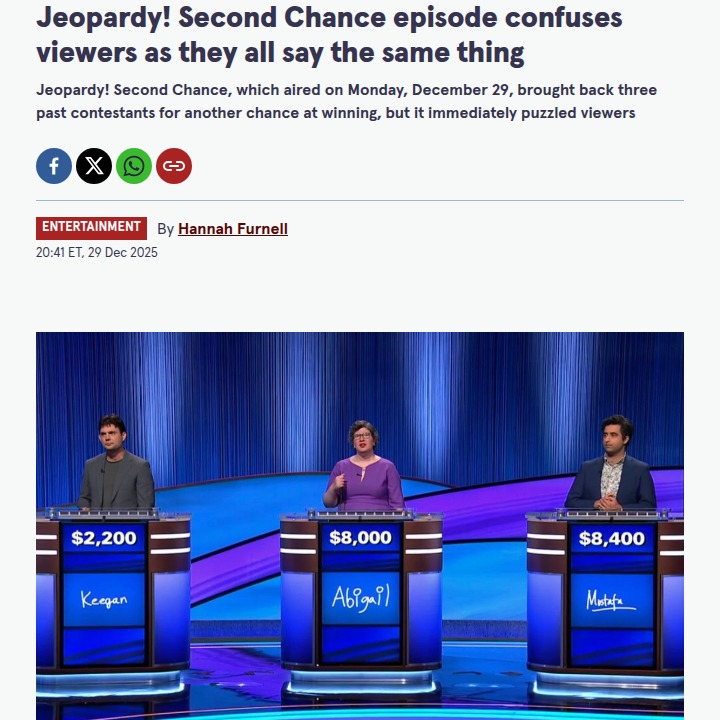 Victoria Garcia+FollowJeopardy! Fans Can't Remember Contestants 🤔Jeopardy! Second Chance just threw everyone for a loop—viewers flooded Reddit saying they couldn’t remember any of the returning contestants! The biggest twist? Despite the collective amnesia, Abigail Arnold dominated the episode and now has fans buzzing about her epic win. Some are even debating if this was the most surprising runaway victory in Second Chance history. Is Jeopardy! missing the mark with memorable contestants, or is Abigail about to become a new fan favorite? #Entertainment #TVSeries #Jeopardy00Share