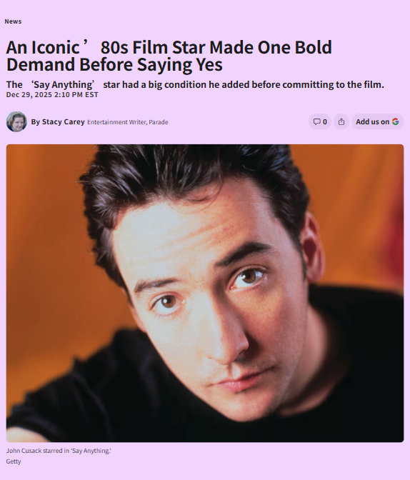 esaunders+FollowJohn Cusack’s Say Anything Rewrite Twist! 🎬Did anyone else know John Cusack almost turned down Say Anything? He only agreed to play Lloyd Dobler if he could rewrite the part with Cameron Crowe! Fans are split—some say Cusack’s changes made Lloyd iconic, others think the original script would’ve worked. Wild to think the heartthrob role that defined him almost didn’t happen. What do you think—was Cusack right to demand creative control? #Entertainment #Movies #JohnCusack00Share