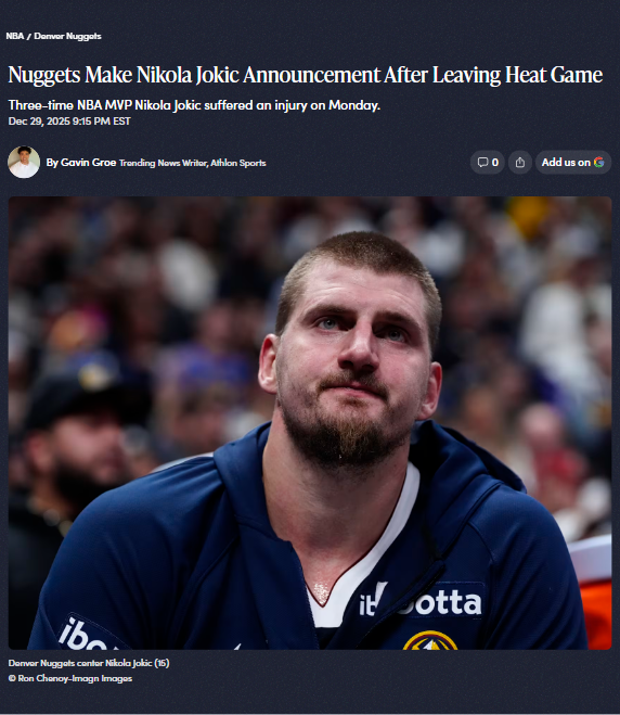 Dawn Fritz+FollowJokic injury shakes up Nuggets’ seasonNikola Jokic’s left knee injury last night could be a game-changer for the Denver Nuggets, especially after their tough 147-123 loss to Miami. With his status still up in the air, fans are left wondering how the team will bounce back as they head to Toronto next. Meanwhile, Sheridan’s boys basketball team is on fire at the Cactus Jam, and UW’s John Michael Gyllenborg is headed to the Senior Bowl. With so much happening, which story has you most fired up: Jokic’s injury, Sheridan’s hot streak, or the big moves in Wyoming football? #Sports #JokicInjury #Nuggets00Share
