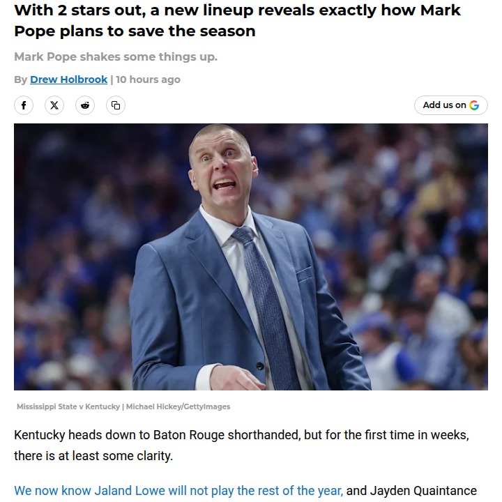 Ryan Lopez+FollowKentucky basketball’s wild season shakeupKentucky fans are feeling the heat as the Wildcats’ season takes a surprising turn, with tough losses sparking real questions about the team’s direction. Meanwhile, over at LSU, head coach Matt McMahon is suddenly on the hot seat after a string of disappointing games. It’s not just about wins and losses—these shifts could mean big changes for both programs. What do you think is behind Kentucky’s struggles, and does LSU need a fresh start? Share your thoughts on what’s next for these storied basketball teams! #Sports #Basketball #KentuckyBasketball00Share