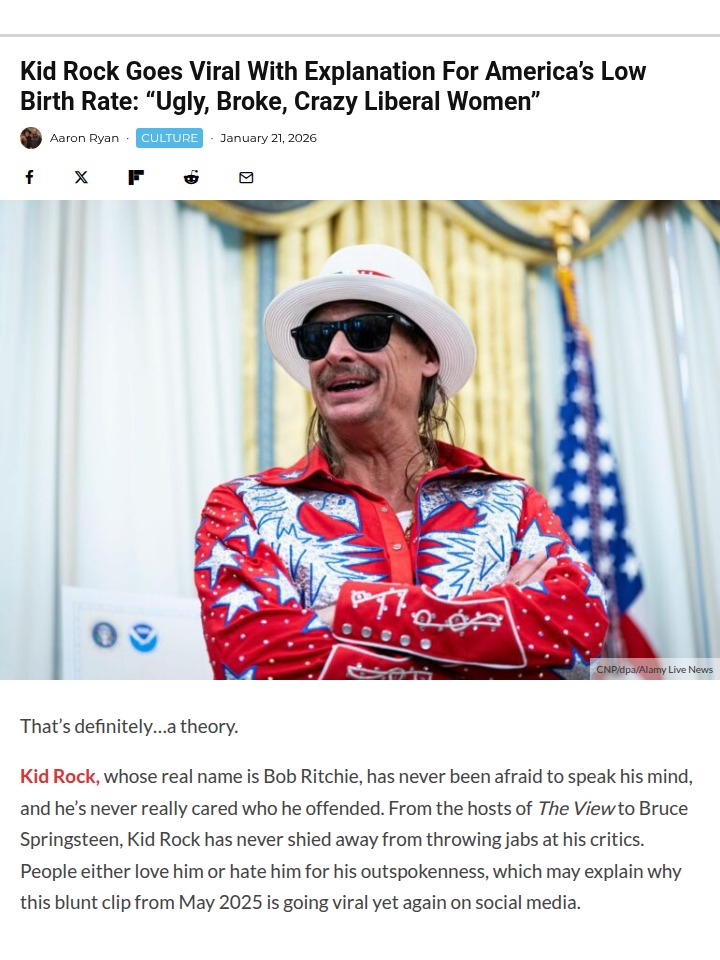 Gina Reynolds+FollowKid Rock's Wild Birth Rate Take 🤯Kid Rock is stirring up the internet again with his blunt theory on America’s low birth rate, blaming what he calls “ugly, broke, crazy liberal women.” The clip from his Fox News appearance is going viral, sparking a heated debate between fans and critics. Some are actually agreeing with him, while others (like Dolly Parton’s sister!) are clapping back hard. The drama is real—whose side are you on in this culture war? #Entertainment #Celebrity #KidRock136Share