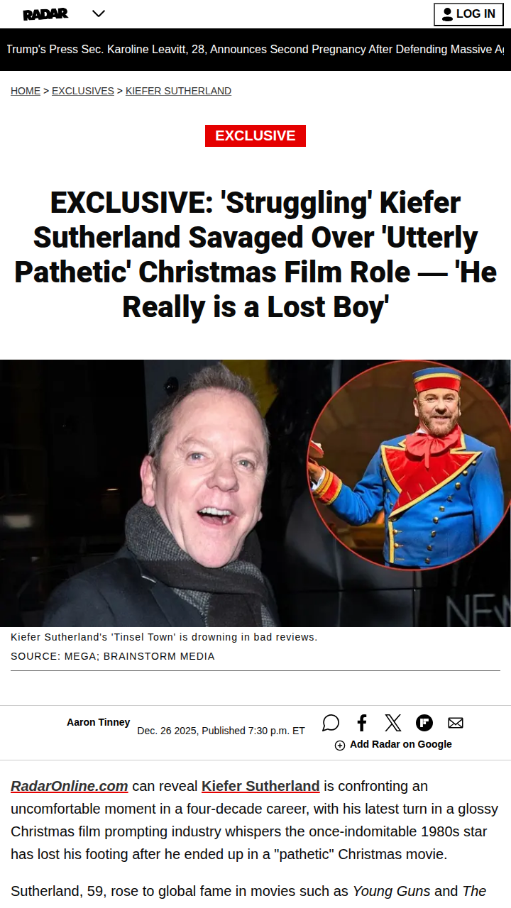 Kelsey Cook+FollowKiefer Sutherland's Christmas Movie Flop? 🎬Kiefer Sutherland fans are seriously divided after his latest role in the holiday flick Tinsel Town. Some are calling it a career low, saying he’s just taking any gig to stay relevant post-24. Others argue he’s just exploring new territory. The biggest debate: has Kiefer really lost his edge, or is Hollywood just being harsh on a legend? The "Lost Boy" jokes are everywhere! #Entertainment #Movies #KieferSutherland00Share