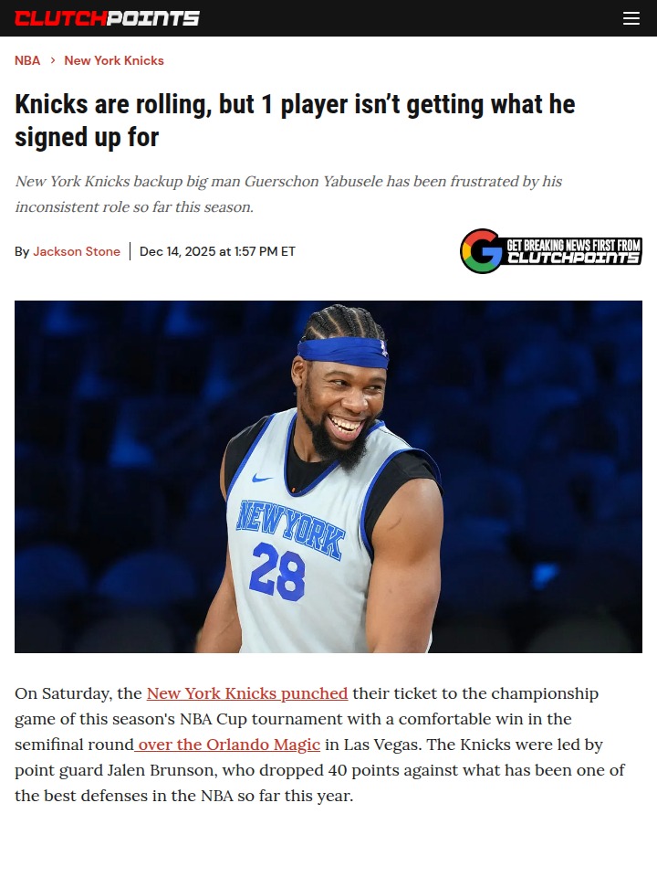 summersivan+FollowKnicks vs Magic: Brunson Shines, Yabusele FrustratedWhat a run for the Knicks! After Jalen “The Villain” Brunson torched the Magic for 40 to send us to the NBA Cup final, there’s a bit of drama brewing. Guerschon Yabusele, who joined this summer, opened up about his struggles with a shifting role and limited minutes. While the squad is rolling, it’s tough seeing a talented big like Yabusele not fully fitting in yet. Anyone else think Coach Brown should give him a more defined spot? #Sports #Basketball #Knicks00Share