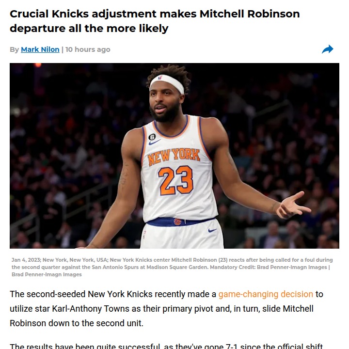 Brian Gaines+FollowKnicks’ bold lineup shakeup could mean Robinson’s exitKarl-Anthony Towns taking over as the Knicks’ main center has sparked a hot streak—7 wins in 8 games and a huge boost in scoring. But this success comes with a twist: Mitchell Robinson, once a core piece, is now coming off the bench, and his future in New York looks shaky. With the Knicks facing tough salary cap decisions and Robinson’s contract expiring soon, a trade before the deadline feels more likely than ever. If you were running the Knicks, would you keep Robinson or cash in while his value’s still high? #Sports #Basketball #Knicks30Share
