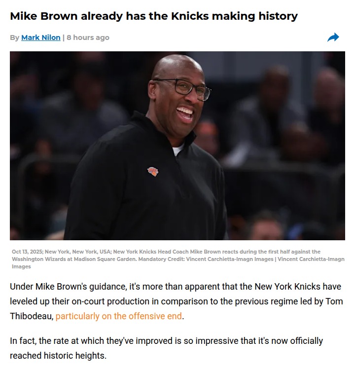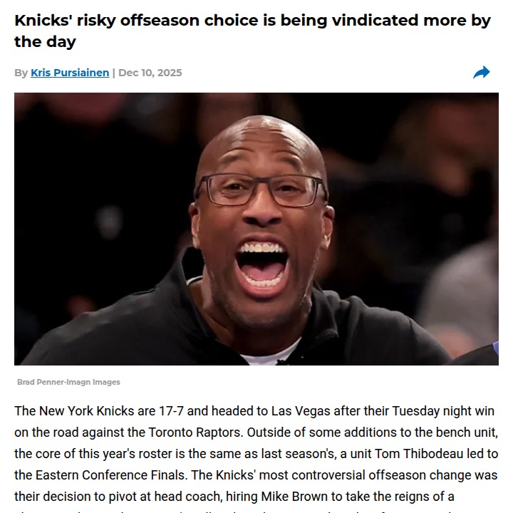 Amy Tanner+FollowKnicks’ bold coaching move is paying offNew York’s decision to hand the reins to Mike Brown is looking smarter every game. The Knicks are not just winning—they’re playing with a sharper offense and a defense that hasn’t missed a beat, even with key players sidelined. Brown’s tweaks, like speeding up the pace and letting the team fire off more threes, have the Knicks outscoring almost everyone in the league. Fans were worried about changing coaches after last season’s playoff run, but the numbers don’t lie: this gamble might be exactly what the Knicks needed. What do you think—are you buying into the new Knicks era? #Sports #Basketball #Knicks10Share