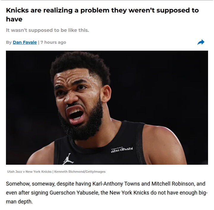 Ryan Lopez+FollowKnicks’ big-man depth is suddenly a problemThe Knicks were supposed to have one of the deepest frontcourts in the league, but now it’s looking like a real weak spot. Even with Karl-Anthony Towns and Mitchell Robinson, plus the addition of Guerschon Yabusele, New York is scrambling for reliable bigs—especially when injuries or rest days hit. Robinson’s limited minutes and Yabusele’s struggles have forced the team to lean heavily on Towns, who’s been inconsistent. With the trade deadline approaching, should the Knicks make a move for another big man, or do they have bigger issues to fix first? Let’s hear your take, Knicks fans! #Sports #Basketball #Knicks20Share