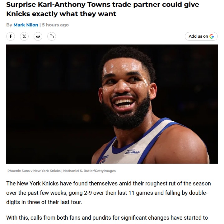 Oscar Gonzalez+FollowMavs Humble Knicks: Locker Room Turmoil?Tough night for the Knicks as the Mavs, missing key stars, blew them out and exposed some serious cracks in New York’s armor. Melo called out KAT for letting the noise get to him, and T-Mac doubled down, saying the team’s lost its defensive identity. With the trade deadline looming and Towns’ name swirling in rumors, it feels like something’s gotta give. Is this just a rough patch, or are we seeing the end of this Knicks core? #Sports #Basketball #Knicks00Share