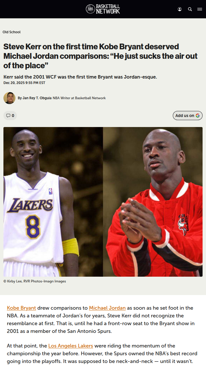 Brian Gaines+FollowWhen Kobe Became MJ: Spurs Fans RememberSpurs fans, do you remember that 2001 playoff series when the Black Mamba officially entered the Jordan zone? Steve Kerr, who played with MJ, said he finally saw the resemblance when Kobe single-handedly shut down our comebacks. Game 1 was close until No. 8 took over, dropping 45 and silencing the crowd. That was the moment Kobe stopped being just a prodigy and started getting legit MJ comparisons. Thoughts on how that series changed the rivalry? #Sports #Basketball #KobeBryant00Share