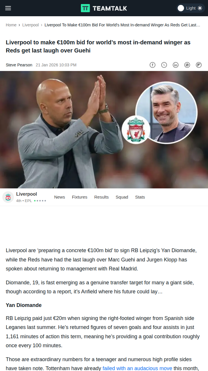 Charles Mills+FollowReds Eye Diomande: Transfer War Heats UpLooks like the Reds are going all-in for RB Leipzig’s teenage sensation Yan Diomande, prepping a €100m bid to beat out Spurs, United, and more. Diomande’s dream is Anfield, and with his goal-per-minute stats, he could be the next big thing. Meanwhile, Liverpool dodged a bullet with Guehi’s massive wage demands—let City deal with that headache! Thoughts on Diomande’s fit in Klopp’s old system? #Sports #Soccer #LFC00Share