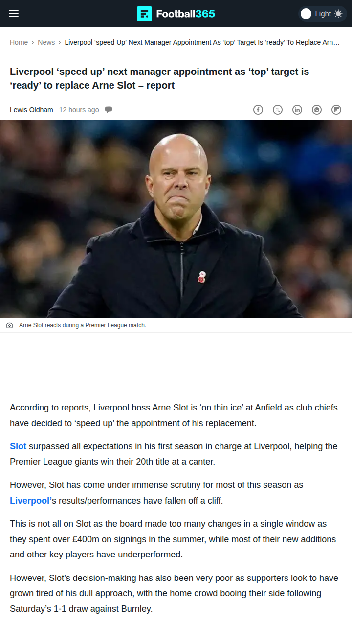 Maurice Miller+FollowSlot Under Fire After Liverpool vs Burnley DrawReds fans, what’s your take on Arne Slot’s future after that fourth straight PL draw, especially with Anfield echoing those “attack, attack, attack!” chants? The numbers are rough—Slot’s points-per-game is now worse than Hodgson’s infamous run, despite having stars like Alisson and Van Dijk. FSG say he’s safe for now, but with Xabi Alonso back on the market, is it time for a change or do we stick with the Dutchman? #Sports #Soccer #LFC00Share