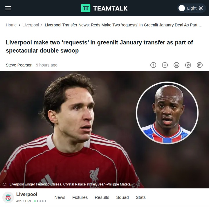 kochcandice+FollowSalah’s Return Shakes Up Liverpool’s Transfer PlansBig news for the Reds faithful: King Mo is back from AFCON, and his return couldn’t come at a better time. Liverpool’s form dipped without him, and now there’s fresh drama around Chiesa’s future. With Juventus pushing for a deal and Liverpool holding firm on their demands, it’s a crucial week for both clubs. Do you think letting Chiesa go without a replacement is a risk, or is Slot right to stick with the tried-and-true? #Sports #Soccer #LFC00Share