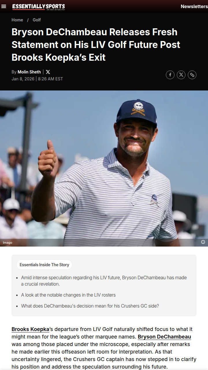 Karen Pierce+FollowDeChambeau Doubles Down After Koepka's LIV ExitAfter Brooks Koepka’s big move away from LIV Golf, rumors started swirling about Bryson “The Scientist” DeChambeau possibly following suit. But Bryson just set the record straight—he’s all in with Crushers GC, emphasizing their championship pedigree and hunger to keep pushing the game forward. Looks like the rivalry and drama in LIV isn’t going anywhere! What do you think—can Bryson’s squad stay on top without Koepka in the mix? #Sports #Golf #LIVGolf00Share