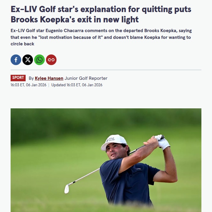 Karen Pierce+FollowKoepka’s LIV Golf Exit: Chacarra Speaks OutBig news in the golf world: Smash GC’s own Brooks Koepka shocked fans with his sudden LIV Golf exit, citing family reasons. But now, Eugenio Chacarra, another ex-LIV player, has shed light on why he left too—hinting at broken promises and lack of motivation. With LIV still fighting for OWGR points and a longer season, could this be a turning point? The rivalry with the PGA Tour just got more interesting. #Sports #Golf #LIVGolf00Share