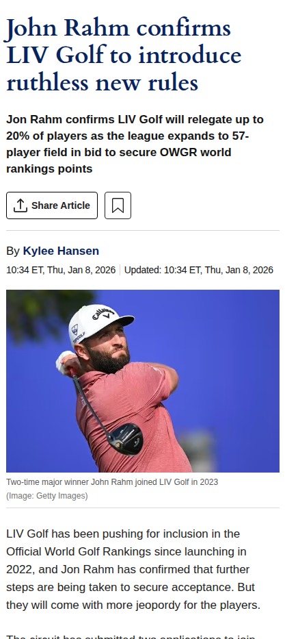 swall+FollowRahm: LIV Golf's Ruthless Roster Shake-UpBig news from the LIV circuit—Jon Rahm just confirmed that the league is going all-in to get those elusive OWGR points, but it’s coming at a cost. Nearly 20% of the field could be cut this season to meet ranking standards. That means more drama, more competition, and a real shot for up-and-comers from the International Series. Is this the move that finally puts LIV on the map, or is it too cutthroat? #Sports #Golf #LIVGolf00Share