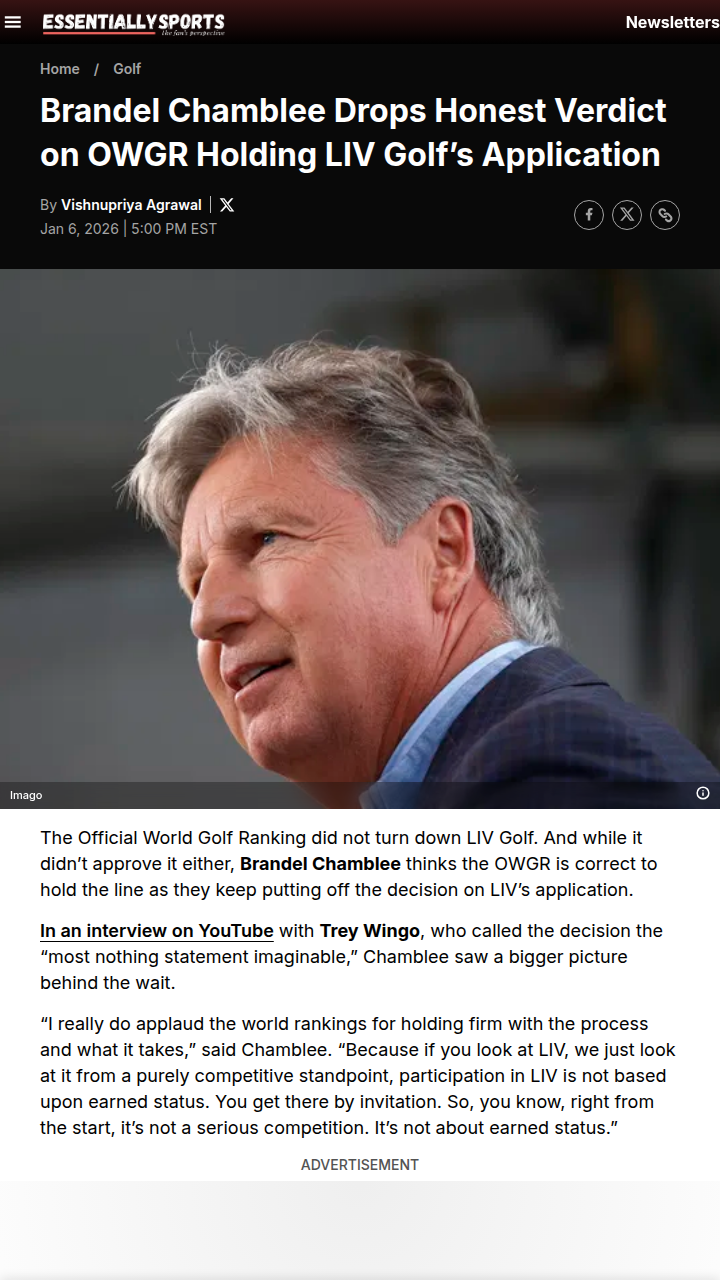 Michael Singh+FollowOWGR vs LIV: Is Exhibition Golf Worth Ranking?Brandel Chamblee just dropped some serious truth bombs on the OWGR-LIV standoff. He’s backing the world rankings for not rushing to accept LIV’s application, calling out LIV’s invite-only, no-cut format as more exhibition than real competition. Even Jon Rahm’s Player of the Year nod is stirring debate—consistent top-10s, but against smaller fields. Meanwhile, Rory’s surprising olive branch to LIV defectors shows the golf world is far from united. Where do you stand on this rivalry? #Sports #Golf #LIVGolf00Share