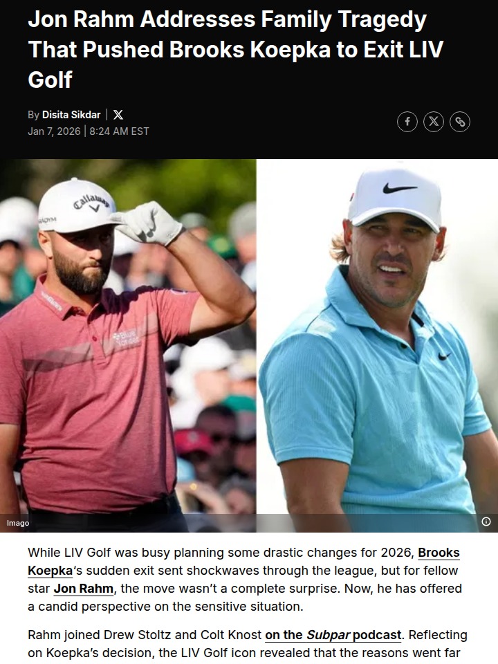 Krystal Lopez+FollowKoepka’s Shocking LIV Exit: Rahm ReactsBrooks “Big Game” Koepka’s sudden departure from LIV Golf has the fairway buzzing, and Jon Rahm just dropped some heartfelt insight on the Subpar podcast. Rahm revealed he sensed Koepka was struggling off the course, especially after the family tragedy with Jena Sims. With Koepka eyeing a PGA comeback, the road’s looking rough due to league rules. Do you think the PGA should make an exception for a major champ like Brooks? #Sports #Golf #LIVGolf00Share