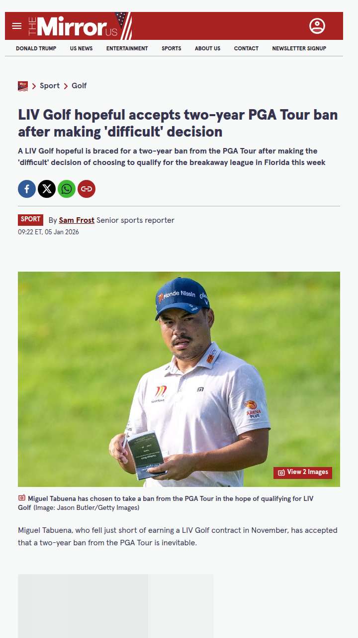 Gabriella Gonzalez+FollowTabuena Bets on LIV, Faces PGA BanMiguel Tabuena, the Filipino ace and two-time Olympian, is taking a big swing by choosing the LIV Golf Promotions event over PGA Tour Q School. That means he’s staring down a two-year PGA Tour ban, but Tabuena says the risk is worth it for his family. With a first-round bye and some serious motivation, can he crack the top three and finally join the LIV ranks? This move could shake up the rivalry between the PGA and LIV even more! #Sports #Golf #LIVGolf00Share