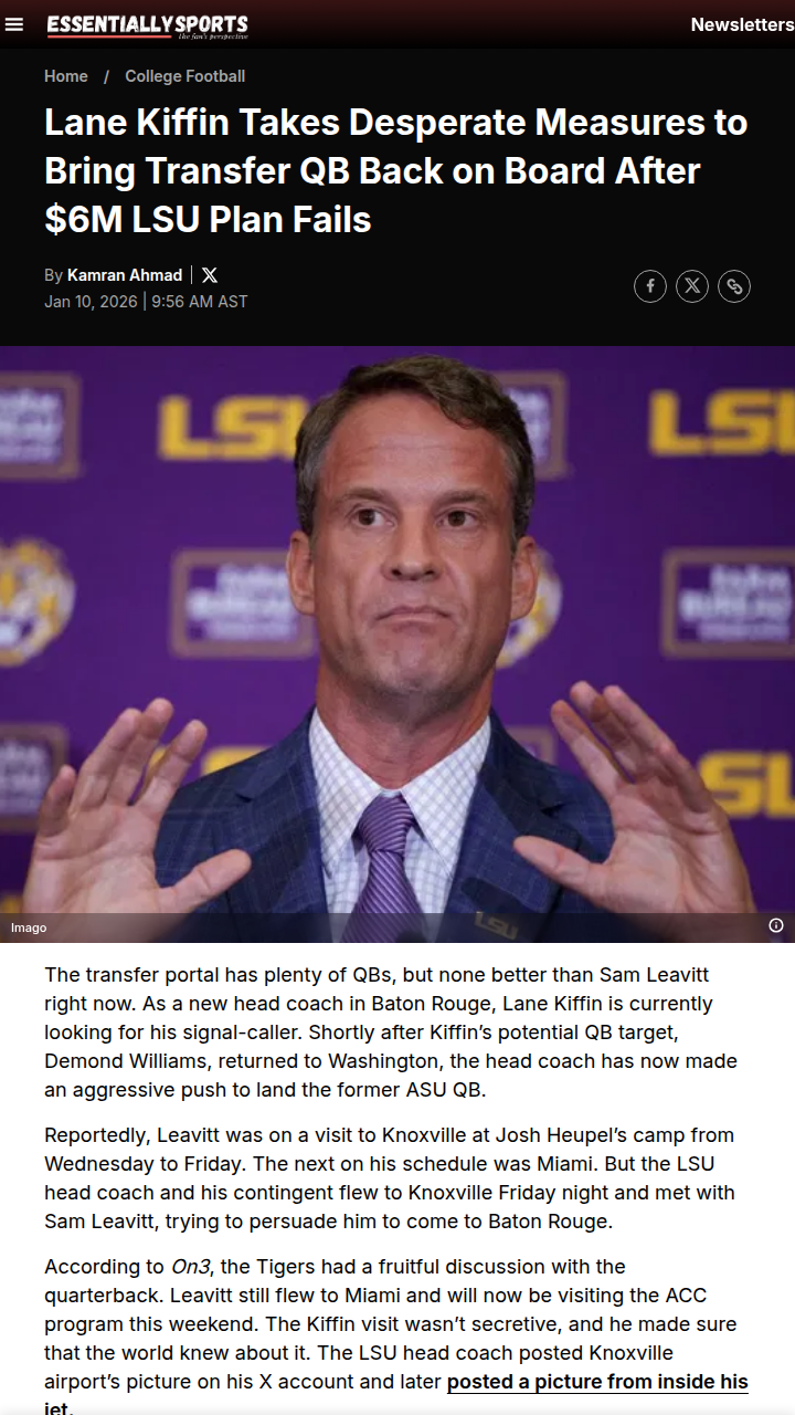 Aaron Taylor+FollowKiffin's All-In Play for Portal Star LeavittLane Kiffin is leaving no stone unturned to bring Sam Leavitt, the top QB in the transfer portal, to Baton Rouge after missing out on Demond Williams. With LSU's QB room empty and Leavitt's dual-threat skills fitting Kiffin's system perfectly, the Tigers are reportedly upping their NIL offer. But with Miami and Tennessee in the mix, can Kiffin seal the deal? This QB chase is getting wild! #Sports #Football #LSUFootball00Share