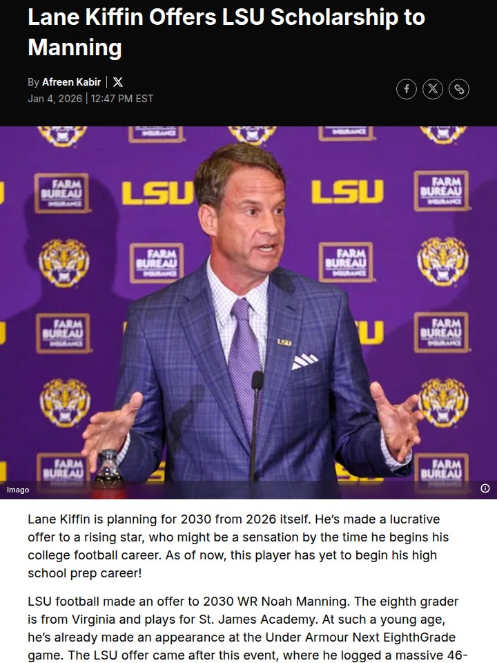 Chad Williams+FollowLane Kiffin's Bold Move: LSU Eyes Young ManningTalk about playing the long game! Lane Kiffin just offered a scholarship to 8th-grade phenom Noah Manning, who’s already turning heads at St. James Academy and the Under Armour Next 8Grade game. With Kiffin also landing 4-star DE Jaiden Bryant, it looks like the Tigers are building a dynasty for the future. Is this the start of a new recruiting rivalry, or just Kiffin being Kiffin? #Sports #Football #LSUFootball00Share