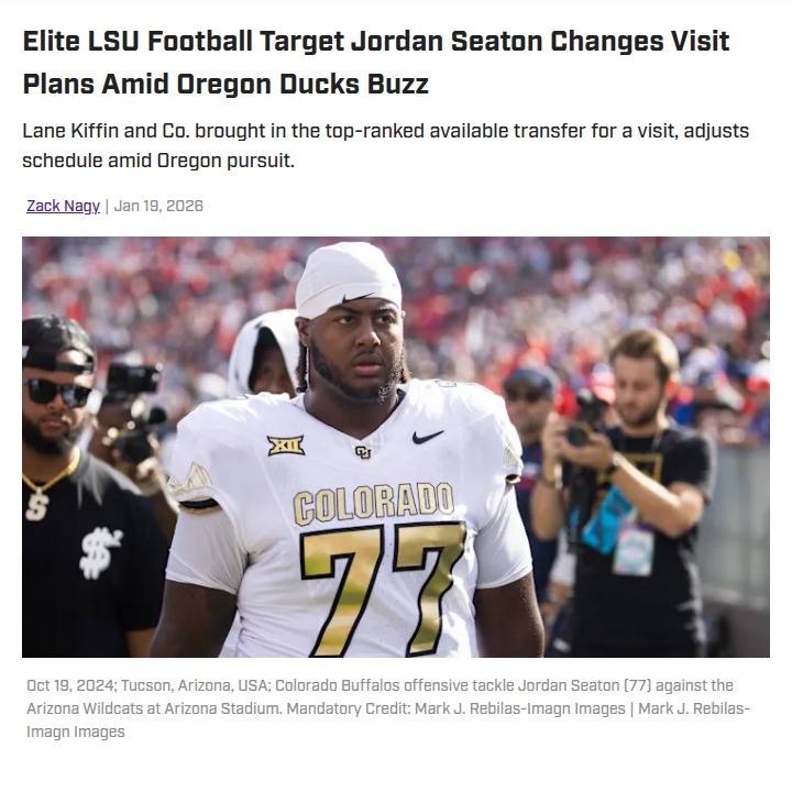 phughes+FollowLSU rolls out VIP treatment for Jordan SeatonLSU is pulling out all the stops to land Jordan Seaton, the top offensive lineman in the NCAA Transfer Portal. Seaton, who started every game as a true freshman at Colorado and didn’t allow a sack in 11 of 13 games, is now visiting Baton Rouge. The Tigers are giving him the full VIP experience, hoping he’ll pick LSU over other big programs like Oregon, Miami, and Mississippi State. With classes starting soon, everyone’s watching to see if Seaton will become the “missing piece” for LSU’s championship hopes. What do you think—will the Bayou Bengals seal the deal? #Sports #Football #LSUFootball00Share