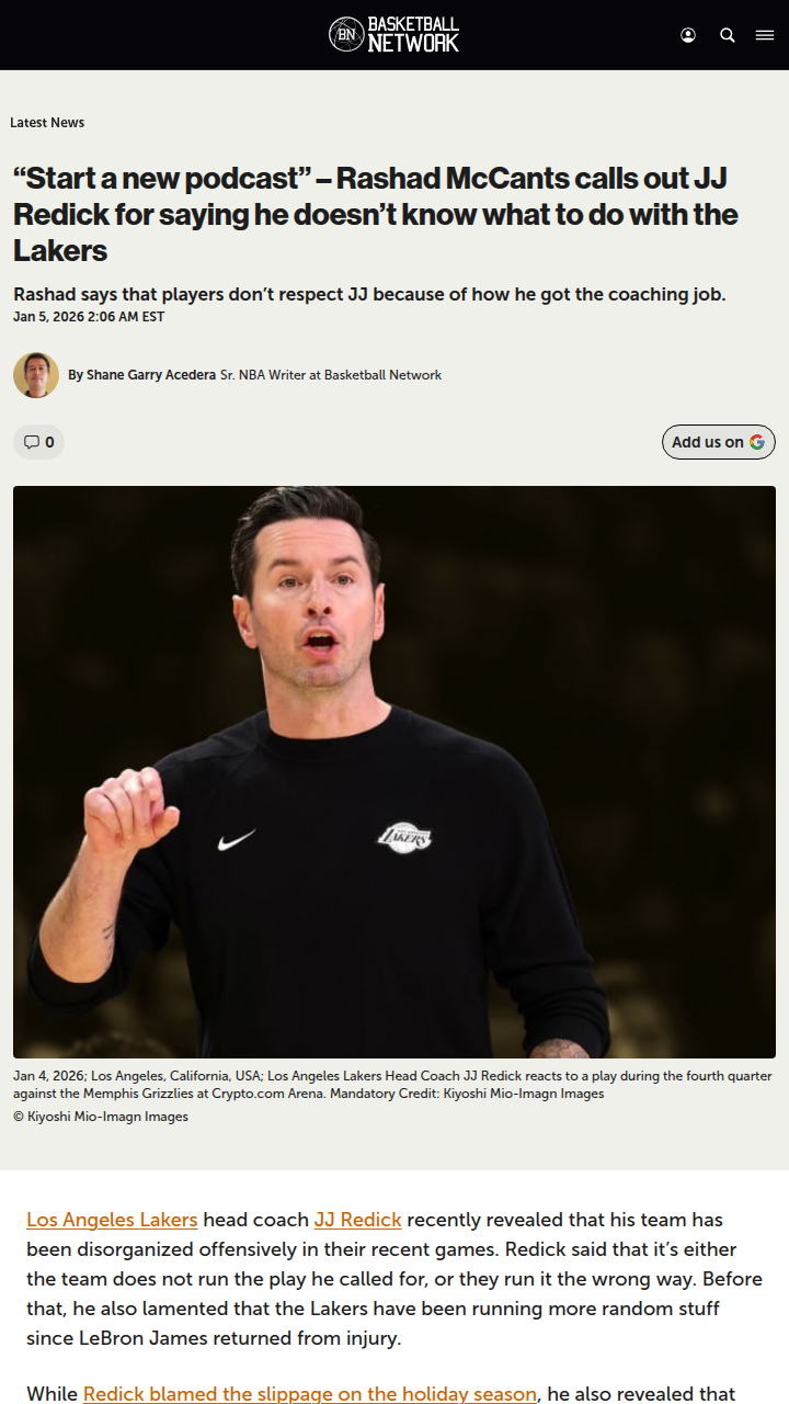 Nicole Obrien+FollowLakers Locker Room: JJ Redick Losing the Huddle?Is Coach JJ Redick losing the Lake Show? After King James returned, the Lakers’ offense has looked lost, and Redick admits he’s out of answers. Rashad McCants didn’t hold back, saying the squad just doesn’t respect JJ—maybe because he went from podcasting with LeBron to drawing up plays for him. Is this just a holiday slump, or is there a deeper rift in the locker room? #Sports #Basketball #LakeShow00Share