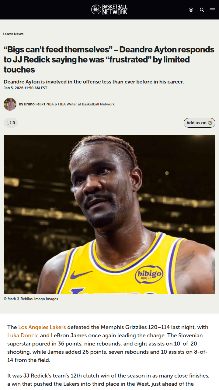 summersivan+FollowShould Ayton Get More Love in LA's Offense?Lakers fans, what do you think about Deandre Ayton’s role lately? After another clutch win led by King James and Luka Magic, JJ Redick called out Ayton’s frustration over his limited touches—even though he was super efficient again. Ayton says he trusts his playmakers, but with Reaves out and LeBron logging heavy minutes, should JJ run more sets for the big fella? Could Ayton be the X-factor for a real title run? #Sports #Basketball #LakeShow00Share