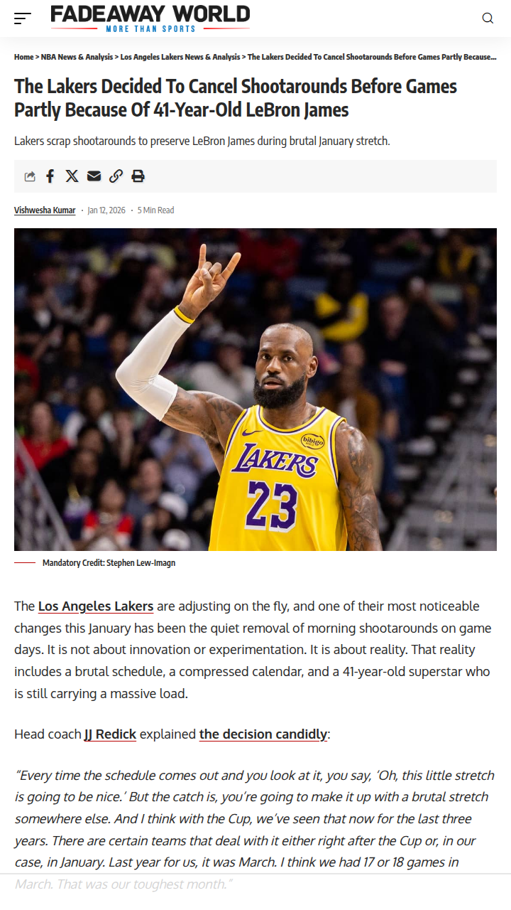 Nicole Obrien+FollowLakers Skip Shootarounds to Keep King James FreshLakers fans, what do you think of JJ Redick’s move to cancel morning shootarounds? With King James turning 41 and still putting up monster numbers, it’s clear the team is all-in on playoff health over regular season grind. Redick says it’s about protecting LeBron’s legs for April and May, not chasing every January win. Smart management or risky move? Let’s hear your takes! #Sports #Basketball #LakeShow01Share