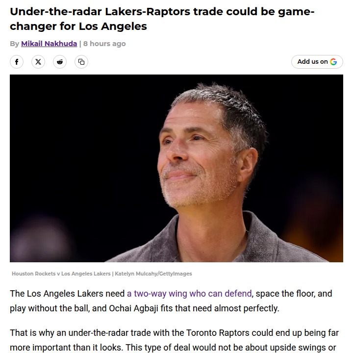 Amy Tanner+FollowCould Agbaji Be the Missing Piece for Lakers?Lakers fans, what do you think about the buzz around Ochai Agbaji possibly coming to LA? The front office seems to be eyeing a low-key but high-impact move for a 3-and-D wing who doesn’t need the ball—exactly what King James and Luka need next to them. Agbaji’s numbers in Toronto don’t tell the whole story; he’s shown he can shine with real minutes. Is this the under-the-radar move that could change our season? #Sports #Basketball #LakeShow00Share