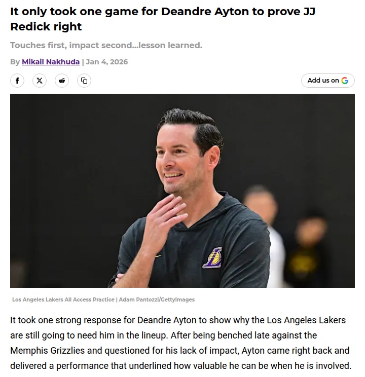 Amy Tanner+FollowAyton Answers Critics in Grizzlies RematchAfter getting benched late by JJ Redick against the Grizzlies, Deandre Ayton came back strong in the rematch to prove his value to the Lakers. The big man was active early, finishing with 15 points, 8 boards, and 3 blocks, showing that when he gets touches, his energy and defense follow. Ayton’s performance helped the Lakers complete the season sweep of Memphis, underlining Redick’s point: keep Ayton involved, and he’ll deliver. Thoughts on how the Lakers should use him going forward? #Sports #Basketball #LakeShow00Share