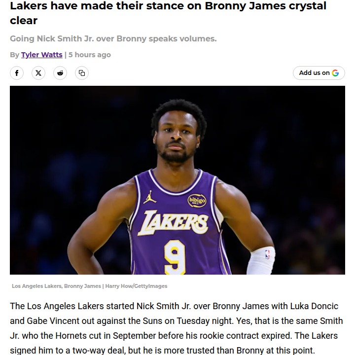 Amy Tanner+FollowLakers’ trust in Bronny James hits new lowThe Lakers just made it clear: Bronny James isn’t part of their plans right now. Even with key players out, coach JJ Redick started Nick Smith Jr.—a recent Hornets castoff—over Bronny, leaving LeBron’s son on the bench until the game was out of reach. Bronny’s minutes have mostly come in blowouts, and his stats haven’t helped his case. It’s tough to watch a fan favorite struggle for real opportunities, especially with the trade deadline approaching. Do you think the Lakers should keep giving Bronny a chance, or is it time to move on? #Sports #Basketball #Lakers10Share