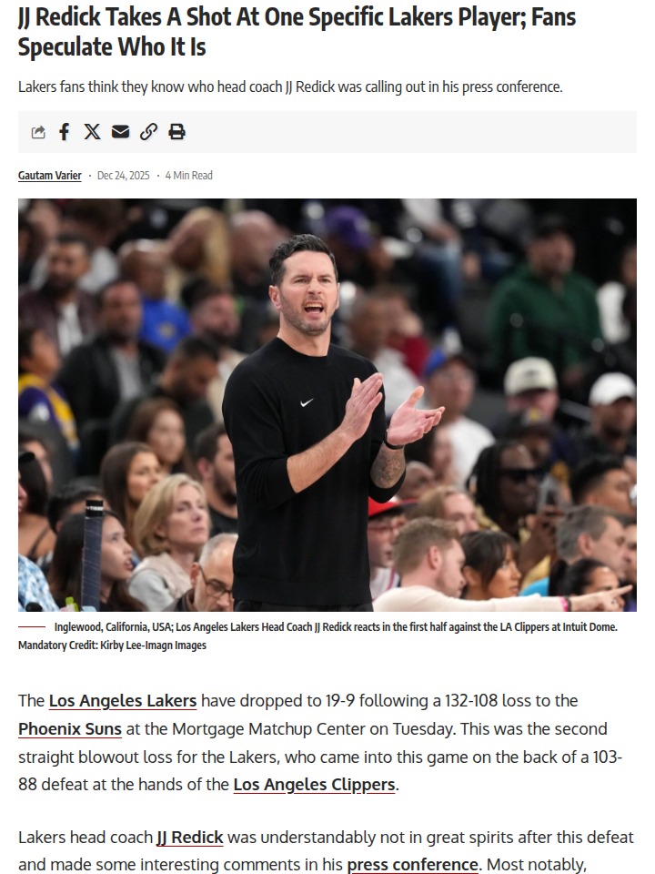 Brian Gaines+FollowJJ Redick’s Old Doc Rivers Critique Haunts LakersLakers fans, what a Christmas meltdown! The Purple & Gold got outworked by Houston, and now Coach JJ Redick is under fire—not just for the loss, but for his own words. Remember when JJ called out Doc Rivers for dodging accountability? Now, after the Lakers’ flat effort, fans are calling Redick a “literal hypocrite.” Even King James looked frustrated. Is JJ repeating Doc’s mistakes, or is this just growing pains for a rookie coach? #Sports #Basketball #Lakers00Share
