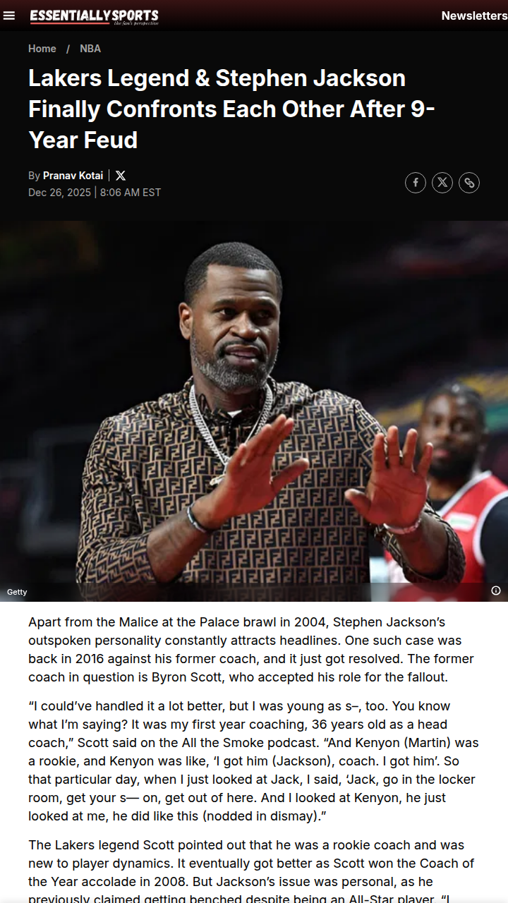 Ryan Lopez+FollowLakers Legend & Stack Jack Bury the HatchetAfter nearly a decade of tension, Lakers icon Byron Scott and Stephen “Stack Jack” Jackson finally hashed things out on the All the Smoke podcast. Scott admitted he mishandled Jackson as a rookie coach, while Jackson stood up for young players like Julius Randle. This long-standing feud, rooted in miscommunication and tough love, now finds closure—showing how NBA rivalries can evolve into respect. Thoughts on Scott’s coaching style and Jackson’s advocacy for players? #Sports #Basketball #Lakers00Share