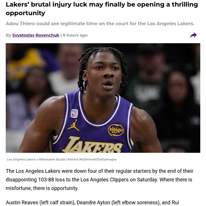Theresa Boyd+FollowLakers’ injuries could spark a rookie shakeupFour Lakers starters are sidelined, and while that’s tough news for fans, it could finally open the door for rookie Adou Thiero to get real minutes in JJ Redick’s rotation. Thiero’s athleticism has stood out in the G League, and with the Lakers desperate for defense, this might be his shot to prove himself on the big stage. LeBron’s message is clear: it’s next man up. If Thiero can turn hustle into stops, he could carve out a role fast. What do you think—should the Lakers lean into developing young talent during this rough patch? #Sports #Basketball #Lakers00Share