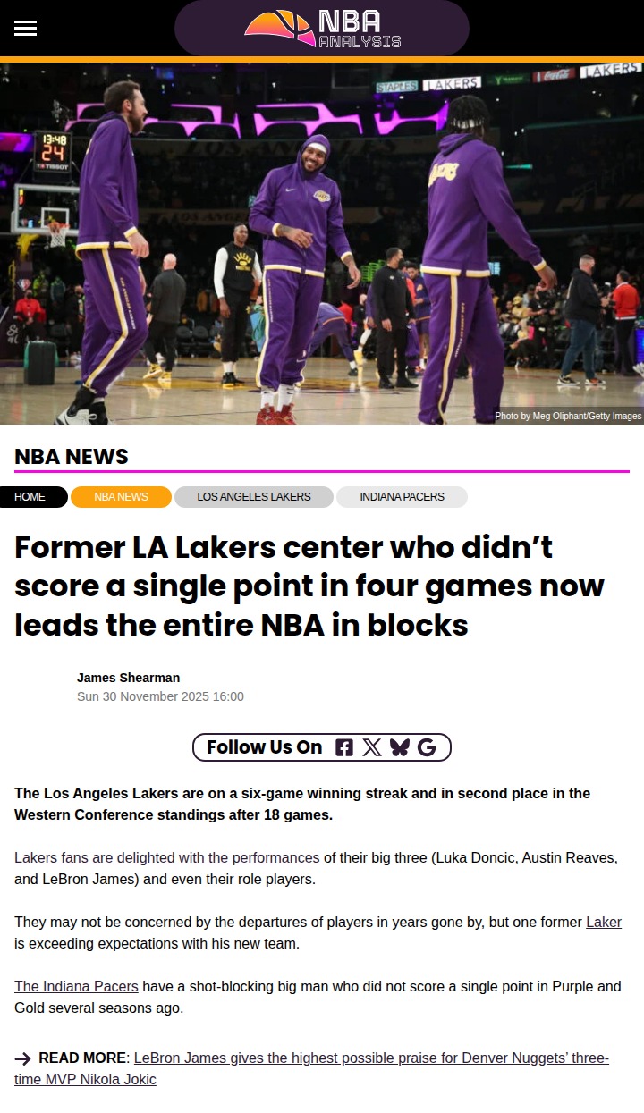 Patrick Gonzales+FollowLakers Let Jay Huff Slip—Now He’s Blocking EveryoneLakers Nation, did anyone see this coming? Jay Huff, who barely got a shot in Purple and Gold (literally didn’t score in four games), is now leading the entire NBA in blocks with the Pacers! While King James and the crew are rolling, it’s wild to see Huff out-blocking even Wemby and Myles Turner. Pascal Siakam just called him an anchor after the Pacers’ clutch win. Are we sleeping on a defensive gem we let walk? #Sports #Basketball #Lakers00Share