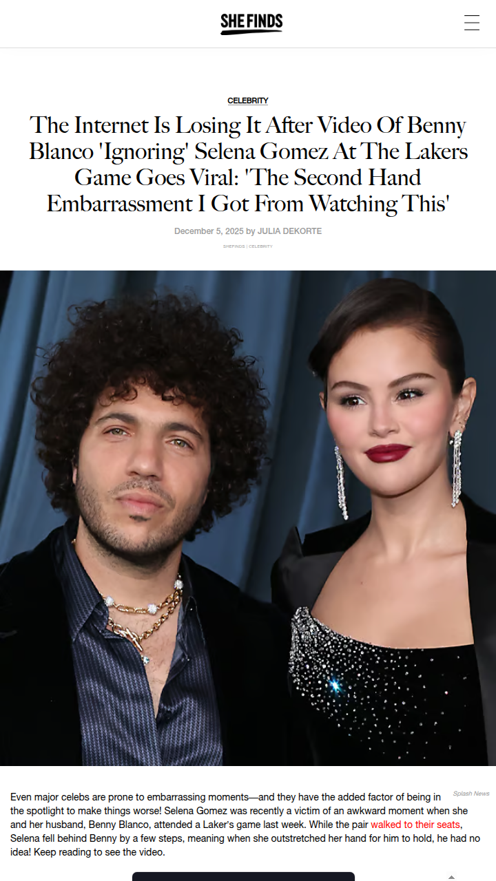 Ryan Lopez+FollowAwkward Benny & Selena Moment at Lakers GameDid anyone else catch that viral courtside moment at the Lakers game? Benny Blanco totally missed Selena Gomez reaching for his hand as they made their way to their seats—talk about secondhand embarrassment! Fans on TikTok went wild, but King Benny redeemed himself by circling back for a sweet selfie with Sel and her fans. Just goes to show, even celebs have those cringe-worthy slip-ups! #Sports #Basketball #Lakers00Share