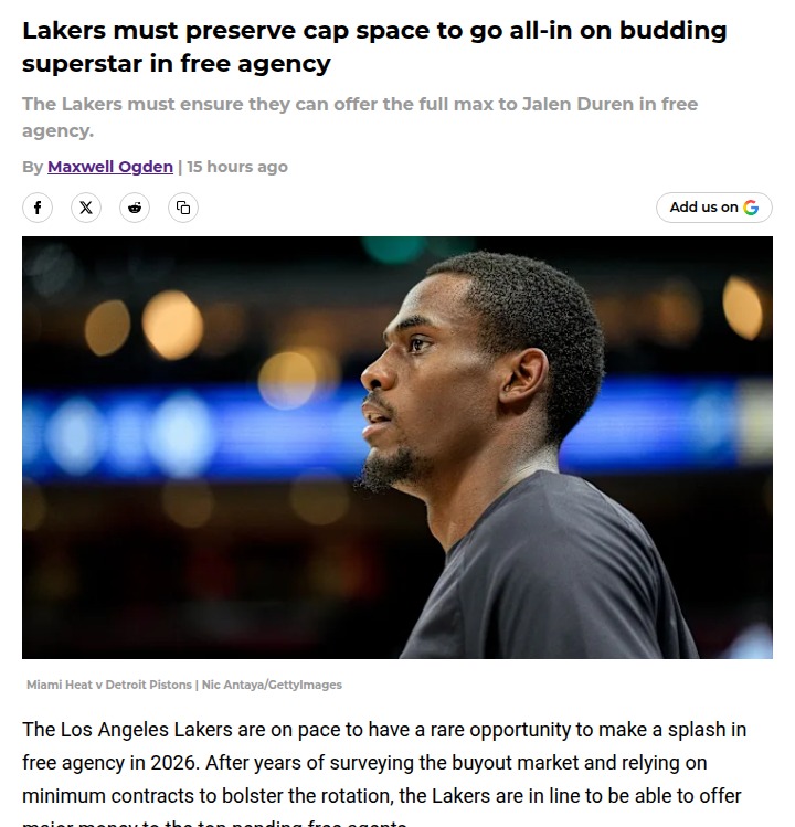 Brian Gaines+FollowLakers eye Jalen Duren for next big moveImagine the Lakers finally having the cap space to chase a true game-changer in free agency. That’s the scenario brewing for 2026, with Jalen Duren—one of the NBA’s most dominant young centers—on their radar. Duren’s blend of power, defense, and efficiency could anchor LA’s future alongside Luka Doncic. The catch? Detroit can match any offer, but the Lakers need to be ready if the Pistons hesitate. If you were running the Lakers, would you risk it all for Duren, or play it safe? Let’s talk about the future of Lakers basketball! #Sports #Basketball #Lakers20Share