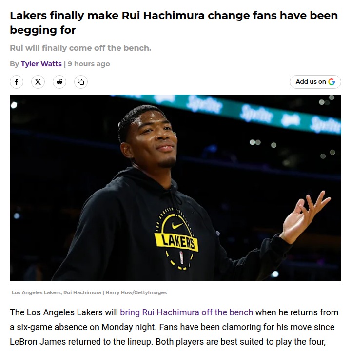 guerrajohn+FollowLakers shake up lineup: Rui Hachimura heads to benchLakers fans have been calling for a lineup change, and it’s finally happening—Rui Hachimura will come off the bench as he returns from injury. This move could be a game-changer for LA, giving Hachimura more chances to shine with the second unit and helping balance the team’s offense and defense. While he’s been a solid starter, the overlap with LeBron has limited his impact. Now, he’ll get more touches and the Lakers might finally see a boost in bench scoring. What do you think—will this new role unlock Hachimura’s full potential? #Sports #Basketball #Lakers00Share
