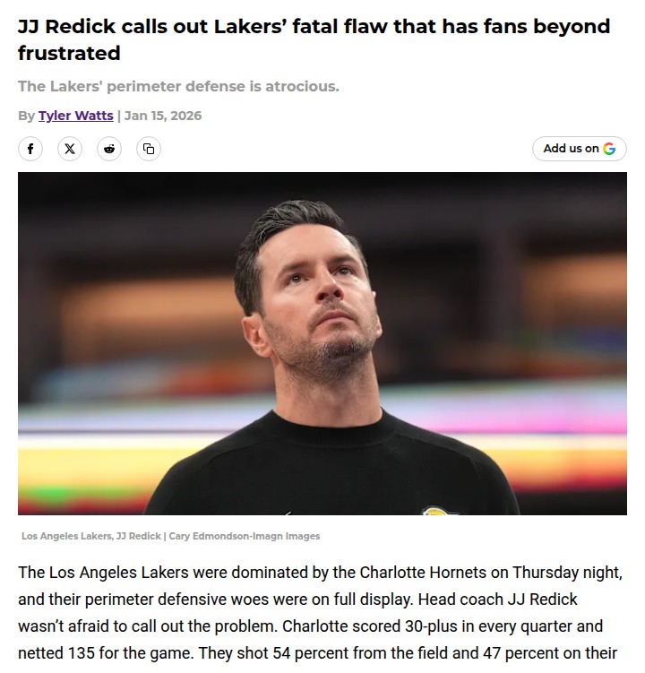 Brian Gaines+FollowHornets Torch Lakers: JJ Redick Sounds the AlarmTough night for the Purple & Gold as the Hornets lit up the Lakers’ defense, dropping 135 points and exposing LA’s biggest weakness—perimeter D. Coach JJ Redick didn’t sugarcoat it, calling out the lack of a true stopper to slow down creators like LaMelo. Without a trade or major buy-in, the Lakers look vulnerable against any team with a dynamic guard. Can Rob Pelinka fix this before the playoffs? #Sports #Basketball #LakersNation00Share