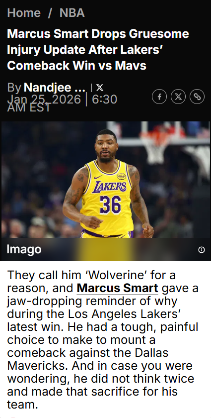 Ryan Lopez+FollowWolverine Smart’s Grit Lifts Lakers Over MavsDid you see Marcus “Wolverine” Smart’s insane toughness last night? In the Lakers’ comeback win vs the Mavs, Smart dislocated his surgically repaired finger in the 4th, popped it back in himself, and kept playing! That crucial deflection off Cooper Flagg’s pass might’ve saved the game. With King James and Reaves still battling injuries, Smart’s warrior mentality is exactly what the Purple & Gold need on this brutal road trip. Can the Lakers survive if Wolverine has to sit? #Sports #Basketball #LakersNation00Share