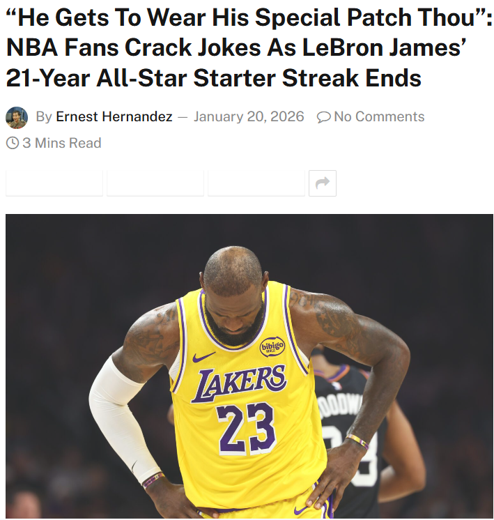 Nicole Obrien+FollowKing James’ All-Star Streak Snapped!For the first time in 21 years, King James won’t be starting in the NBA All-Star Game. The new West lineup—Jokic, Doncic, SGA, Wemby, and even Chef Curry—signals a changing of the guard. Fans are split: some roast LeBron for his defense and age, others salute his epic run. Is this the end of an era, or just a new chapter for LBJ? #Sports #Basketball #LeBronJames00Share