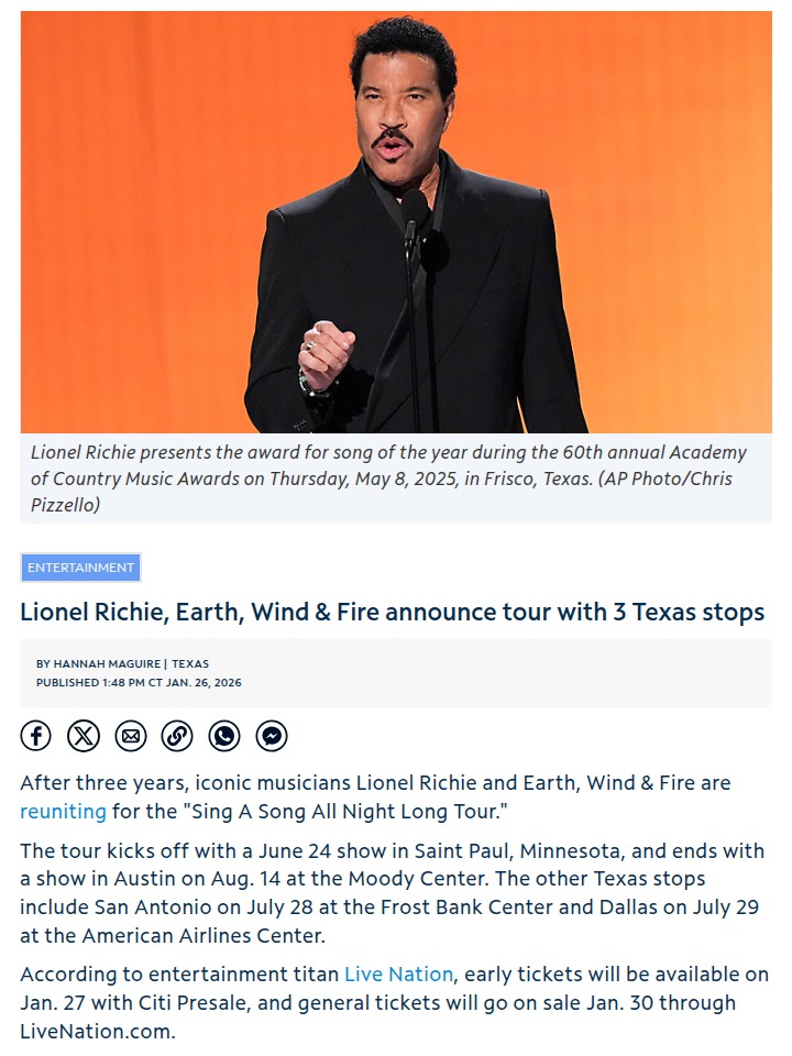 Katherine Banks+FollowLionel Richie & EWF Tour: Is a Collab Coming? 🎤Lionel Richie and Earth, Wind & Fire just dropped their 26-city tour announcement, but fans are buzzing about a possible on-stage collab. Some are convinced they’ll finally perform together, while others think it’s just hype. Remember the last time rumors like this swirled? Will we get a legendary joint performance or just separate sets? The debate is on! #Entertainment #Music #LionelRichie20Share