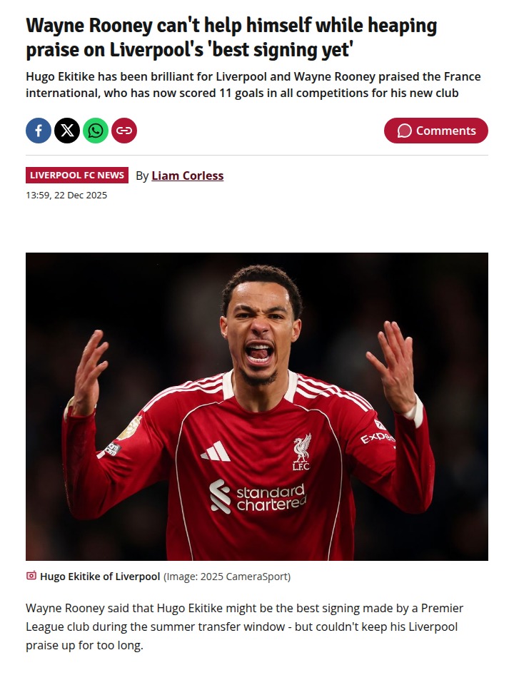 Tara Moran+FollowRooney Tips Hat to Liverpool’s Hotshot EkitikeEven King Rooney can’t ignore what Hugo Ekitike is doing for the Reds right now. Despite Liverpool splashing big on Wirtz and Isak, it’s Ekitike who’s stealing the show—three goals in his first three, and now five in his last three Premier League games. Rooney admits the pressure was massive, but Ekitike’s consistency and attitude have made him the top signing of the summer. Liverpool’s unbeaten streak is no fluke with this guy leading the line! #Sports #Soccer #Liverpool00Share