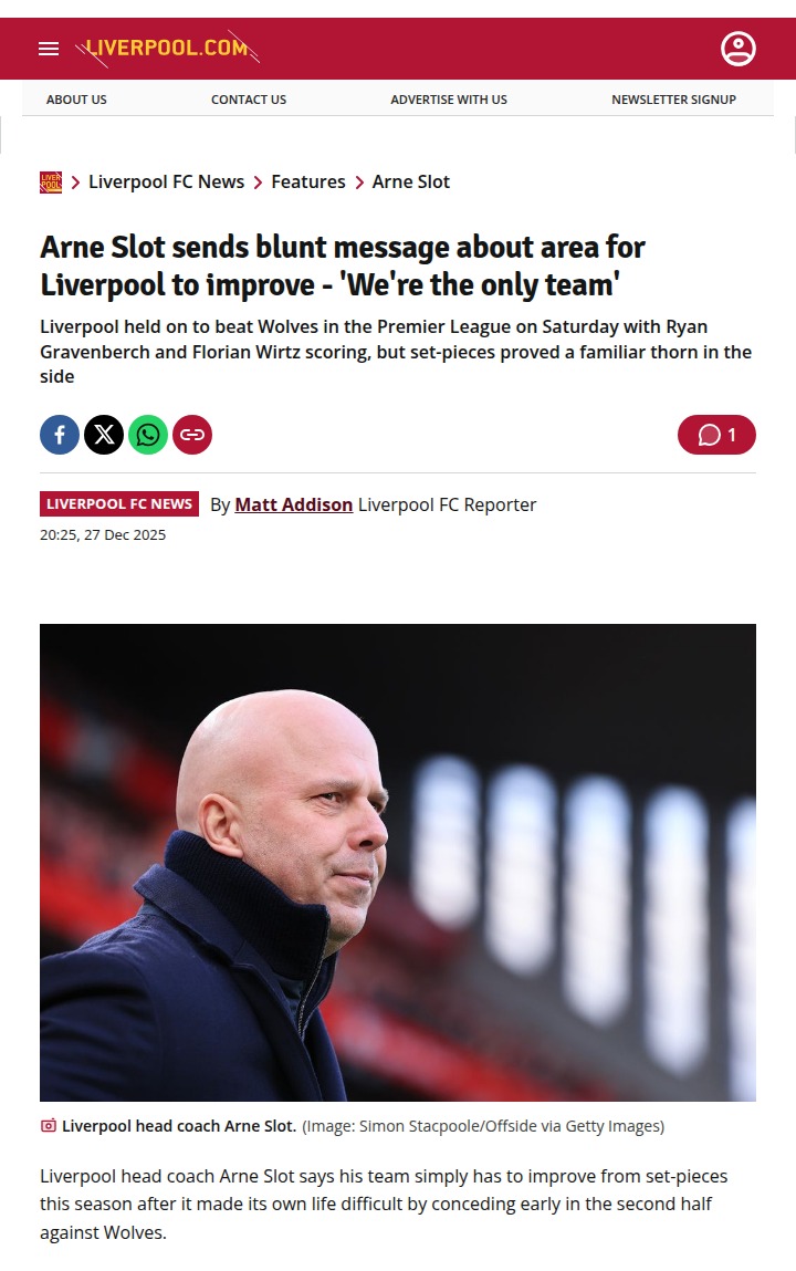Allison Travis+FollowSet-Piece Struggles Haunt Liverpool vs WolvesReds fans, are we the only ones sweating every corner? Arne Slot called out Liverpool’s set-piece woes after Wolves clawed one back from a corner, nearly flipping the script. While Gravenberch and Wirtz put us ahead, it’s clear we’re not capitalizing on dead balls—plus, we’re leaking goals from them! Slot’s honesty is refreshing, but can the Reds finally turn set-pieces into a weapon, not a weakness? Let’s talk solutions! #Sports #Soccer #Liverpool01Share