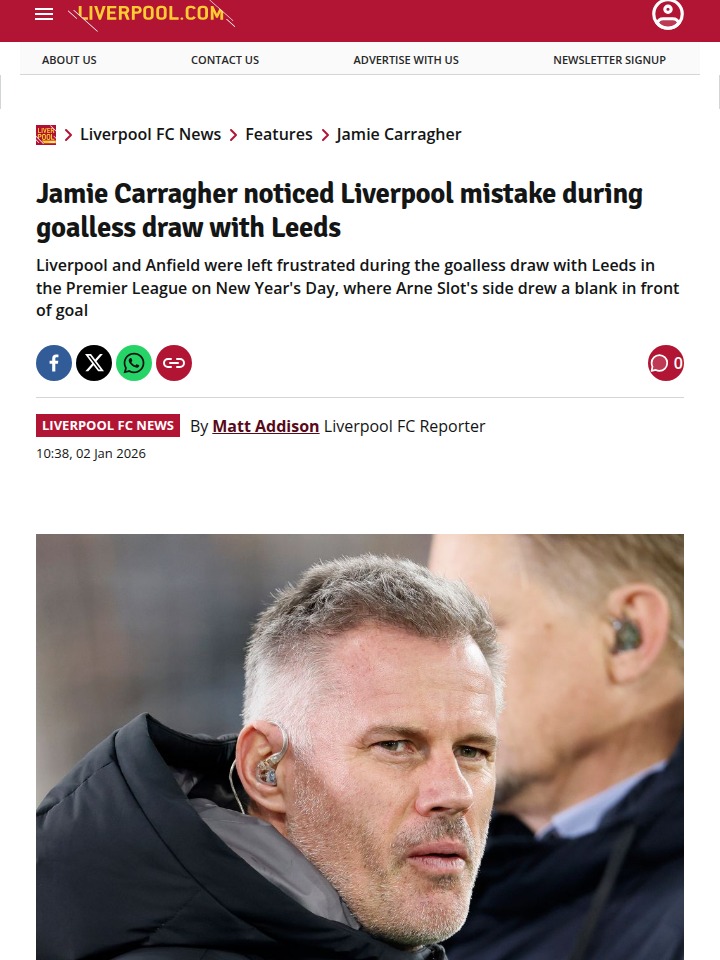 Tara Moran+FollowLiverpool vs Leeds: Carragher Calls Out Reds’ Flat AttackTough night at Anfield as the Reds were held 0-0 by Leeds, and Jamie Carragher didn’t hold back on Sky Sports. He pointed out how Liverpool’s attack looked one-dimensional, with even King Arne’s new signings like Wirtz and Ekitike struggling to break through. Leeds nearly snatched it, but VAR ruled out Calvert-Lewin’s goal. The Kop felt the frustration—no spark, no crowd lift, and some questionable ref calls. Can Slot get the creativity flowing again? #Sports #Soccer #Liverpool00Share