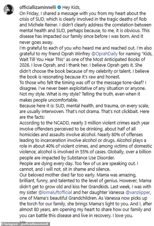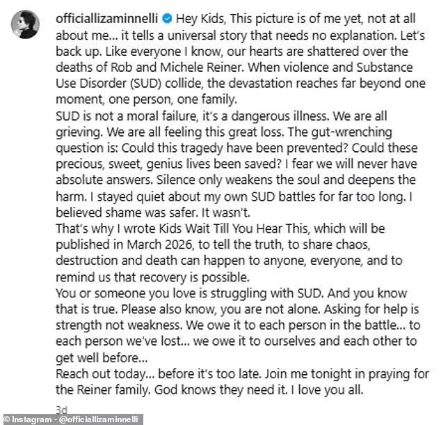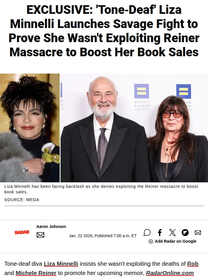 Gina Reynolds+FollowLiza Minnelli's Insta Book Plug Sparks Outrage 😳Liza Minnelli is facing massive backlash after her emotional Instagram post about the Reiner tragedy also promoted her upcoming memoir. Fans are split—some say she’s raising awareness about addiction, while others accuse her of using the horrific event to boost book sales. The debate is getting heated, especially after Liza doubled down, insisting she’s just being honest about her own struggles. Did she cross a line, or is the outrage overblown? #Entertainment #Celebrity #LizaMinnelli00Share
