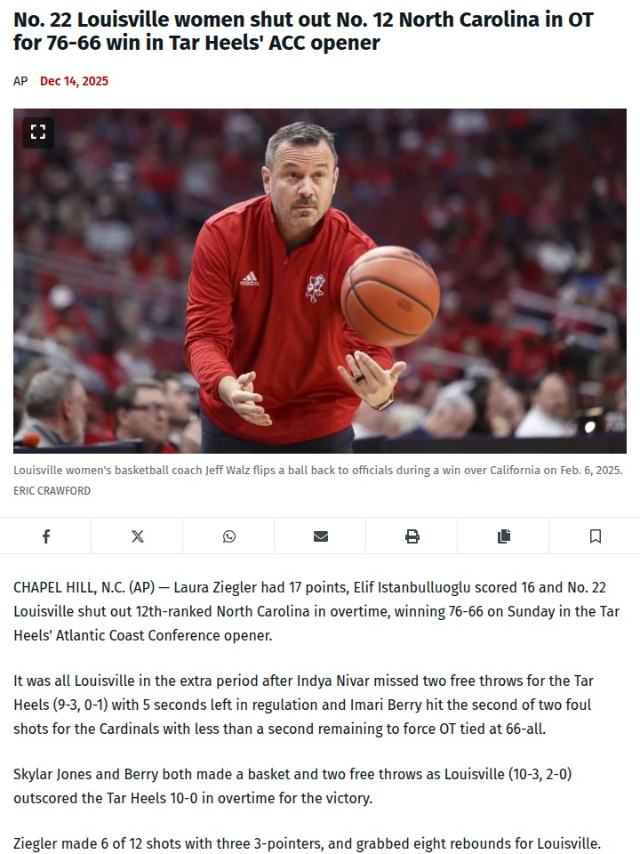 Ryan Lopez+FollowLouisville stuns UNC with OT shutout winLouisville women’s basketball pulled off a jaw-dropping feat by completely shutting out No. 12 North Carolina in overtime, snatching a 76-66 victory right on the Tar Heels’ home court. After a nail-biting finish in regulation, the Cardinals dominated OT with a 10-0 run—UNC didn’t score a single point! Laura Ziegler and Elif Istanbulluoglu led the charge, while Louisville’s bench made a huge impact. For North Carolina fans, this was a tough ACC opener. What do you think made the difference in OT, and how do you see both teams bouncing back from this? #Sports #Basketball #Louisville00Share