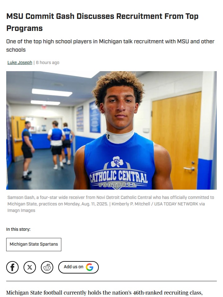 Chad Williams+FollowMSU’s Gash faces big decision as top schools callSamson Gash, Michigan State’s prized wide receiver commit, is suddenly the center of a recruiting tug-of-war. Even though he’s been committed to MSU since June, powerhouse programs like Georgia, Alabama, and Penn State are now in hot pursuit—Georgia even offered him a scholarship. With National Signing Day coming up and MSU’s wide receiver room in flux, Gash’s choice could reshape the Spartans’ future. Family ties to Penn State and the chance to play for a national contender add to the drama. What do you think—should Gash stick with MSU or chase new opportunities? #Sports #Football #MSUFootball00Share