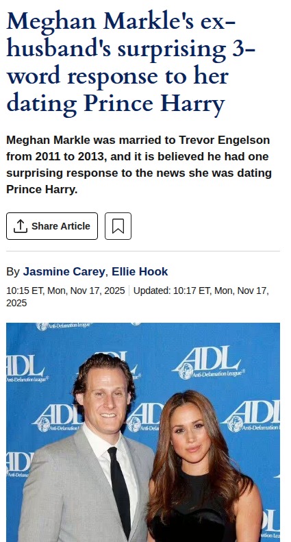 julie72+FollowMeghan's Ex's 3-Word Reaction to Harry 💬Meghan Markle’s ex-husband, Trevor Engelson, reportedly had a jaw-dropping three-word response when he found out she was dating Prince Harry: “Oh, she’ll close.” Fans are buzzing about what he meant—was it shade, support, or just shock? The mystery behind his words has reignited debates about Meghan’s past and how her ex really feels about her royal leap. What do you think Trevor meant? #Entertainment #Celebrity #MeghanMarkle4120Share