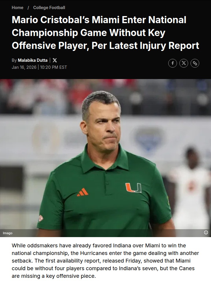 Amy Williams+FollowMiami’s title hopes tested by key injuriesLosing Elija Lofton right before the national championship is a gut punch for Miami fans. He’s been a go-to guy all season, and now the Hurricanes have to adjust their game plan against an undefeated Indiana squad. With other starters like Malik Bryant and Daylyn Upshaw also out, Miami’s depth will be stretched to the limit. Still, after a season full of wild comebacks and upsets, it feels like this team thrives on adversity. Can Miami pull off one more miracle and bring home their first title since 2001? Let’s hear your thoughts—does this change your prediction for the big game? #Sports #Football #MiamiHurricanes00Share