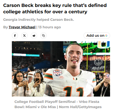 GalacticGiraffe+FollowCarson Beck’s Student-Athlete ControversyDid anyone else catch the buzz around Miami’s QB1, Carson Beck? The Dawgs’ former gunslinger is headed to the National Championship, but not without some drama. Beck admitted he’s not taking classes at Miami, sparking debate about what it means to be a true student-athlete in the NIL era. Is this a loophole or a rule-breaker? Either way, it’s giving the Hurricanes a unique edge before facing Indiana. Thoughts on this shakeup? #Sports #CarsonBeck #MiamiHurricanes10Share